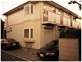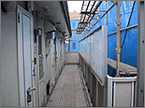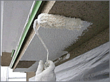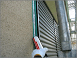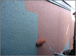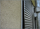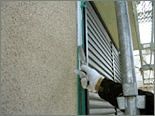 既存の外壁の仕上げ材はリシンと呼ばれるもので、アクリル樹脂に珪砂などを混入し、吹付してあります。2@位の砂が吹き付けてあるように見えるのが吹付リシンと呼ばれる仕上げです。