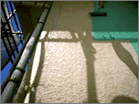使用した上塗り塗料は2液の低汚染型ポリウレタン樹脂塗料です。塗料の特色は付着した汚れが雨水と一緒に落ちやすい親水性の塗料です。弱溶剤型ですので、多少のシンナー臭が発生しますが、あまり密集した地域でなかったので、使用できました。