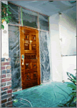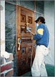 このドアの場合は透明塗料で仕上げてありましたので、ドアの木製生地本来の色をだすために薬品漂白をしましたが、着色してあるドアの場合は、薬品漂白の代わりに着色作業を行います。